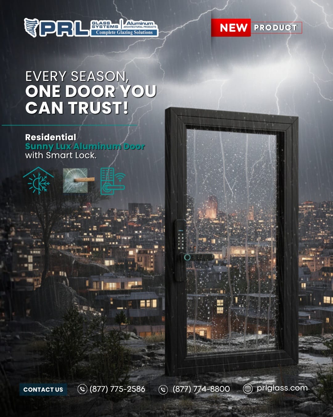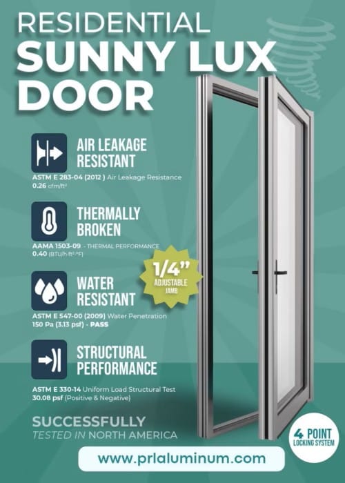 Shop thermally broken aluminum residential doors at PRL of Southern California! Featuring a slim, fully mitered sash, easy one-handed operation, and installer-friendly adjustable jambs, there’s no reason to bid anywhere else. Our Sunny Lux aluminum doors bring the best features to high-end residential entries like custom homes, luxury condos, and coastal retreats Our thermally broken aluminum residential doors deliver extreme performance with true thermal breaks and optional impact or hurricane resistant glass. Successfully tested in North America, you can specify standard or custom applications, multiple door options, and color-matched hardware. So, get yours today! Our thermally broken aluminum residential doors arrive in just 2 weeks!